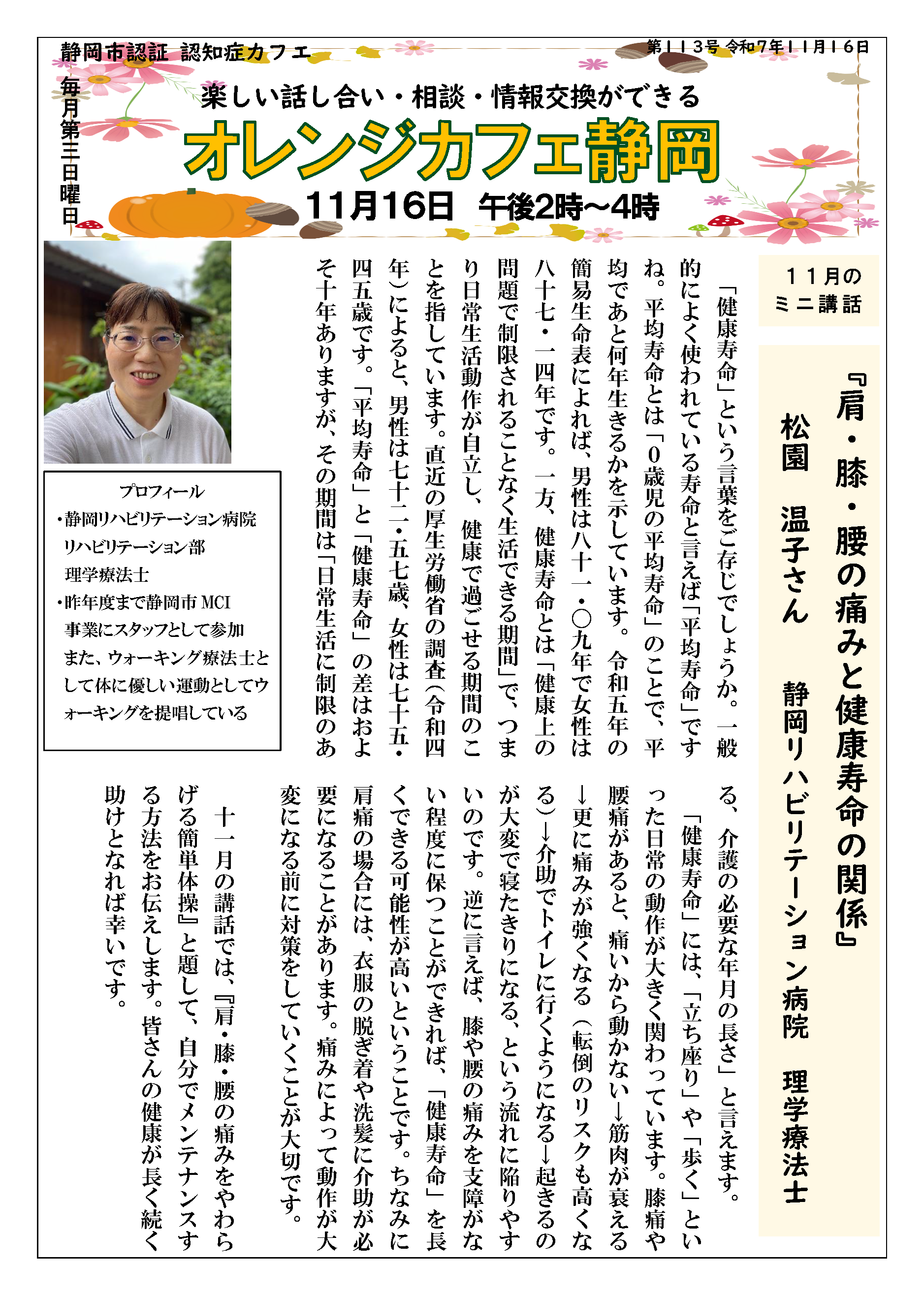 「オレンジカフェ静岡」は、認知症について気になっている方や、家族の方、あるいは医療や介護などで認知症の人のケアに携わっている専門職の方、またそうした人たちのお手伝いや支援をしたいと考えておられるボランティアや住民の方などが気軽に集い、なごやかな雰囲気で交流する場としてオープン致しました。