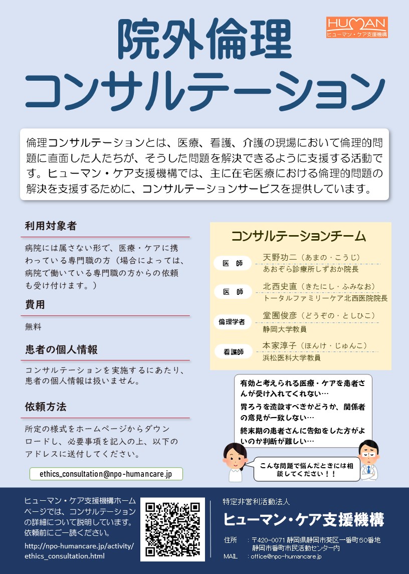 倫理コンサルテーションとは、医療、看護、介護の現場において倫理的問題に直面した人たちが、そうした問題を解決できるように支援する活動です。元々は1970年代にアメリカにおいて始められましたが、2000年以降、日本でもこの活動を実施する病院が少しずつ増えています。しかし、病院の外で生じる倫理的問題に対応するためのコンサルテーションサービスは、いまだほとんど行われていません。そこで本NPOでは、在宅医療における倫理的問題の解決を支援するために、院外倫理コンサルテーションを始めることにしました。日頃医療・ケアを実施する中で解決が困難な問題に直面した場合には、気軽にご相談ください。